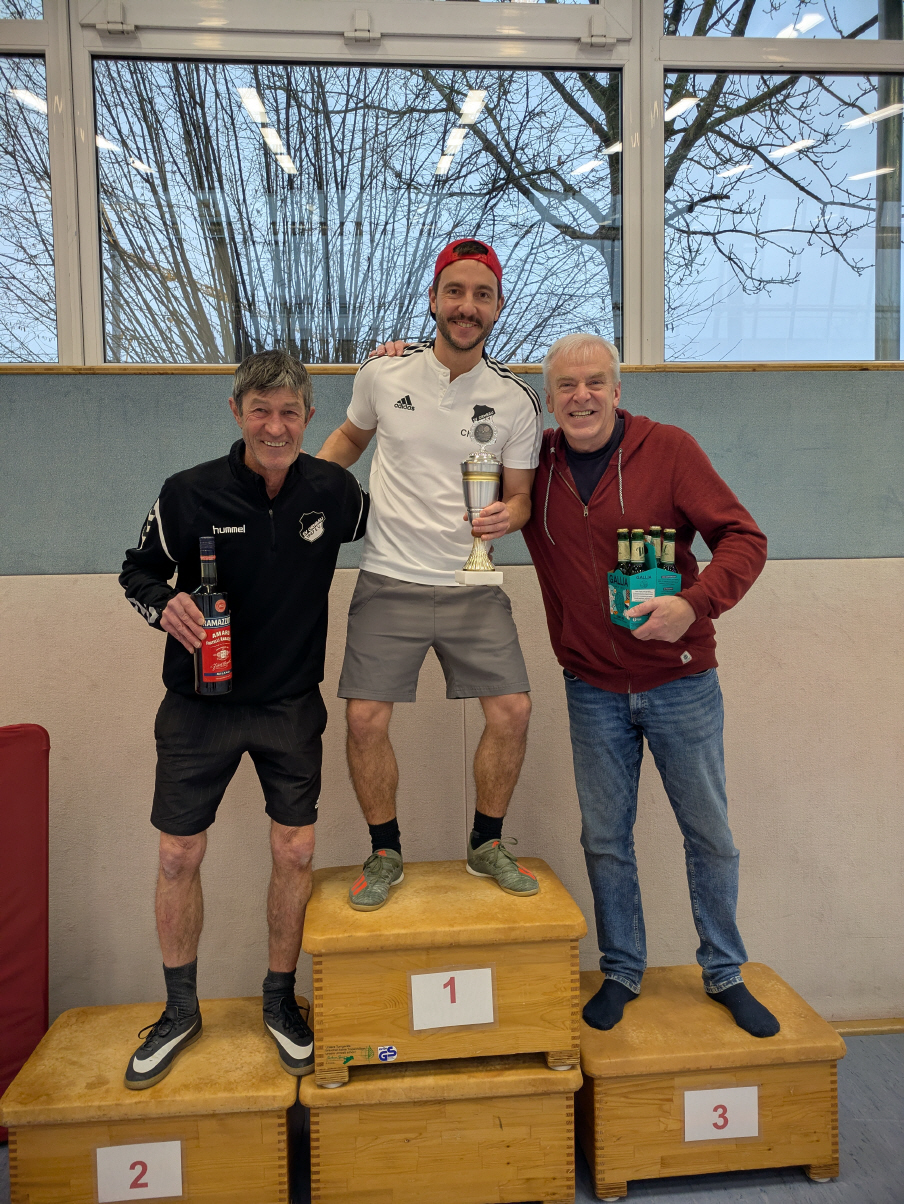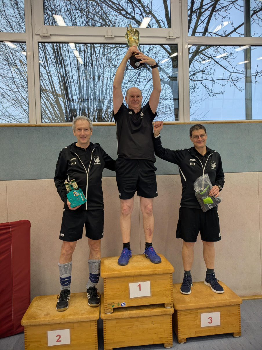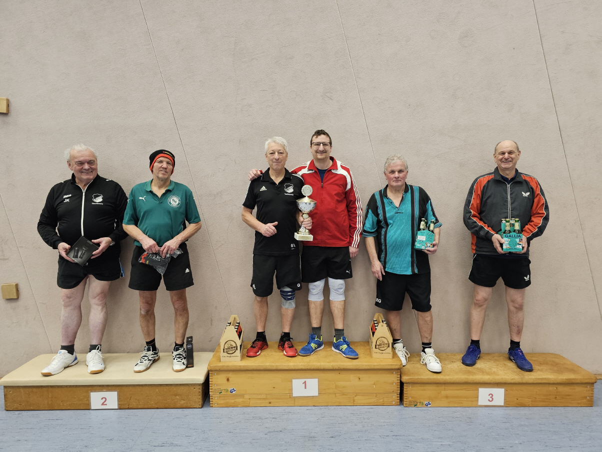 Bei den Einzelmeisterschaften der Vereinsspieler am Sonntag 5.1.25 setzte sich aufgrund seiner starken Form in den letzten Monaten nicht ganz unerwartet unser Abteilungsleiter und Gesicht des Tischtennisvereins Stefan Heinrichmeier durch. Im spannenden und knappen Finale gegen Altmeister Norbert Dott zeigte Stefan wie bereits im gesamten Turnier weiter sein mutiges und spektakuläres Offensiv-Tischtennis und wurde dafür von den zahlreichen Zuschauern gefeiert. Nach einem 0:2 Satzrückstand und bereits mehreren Matchbällen gegen sich, konnte Stefan Heinrichmeier im 5. Satz bei einem 7:10 Punkterückstand das Spiel noch drehen und mit 3:2 Sätzen für sich entscheiden.