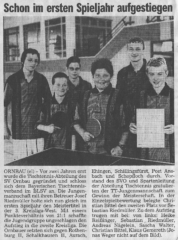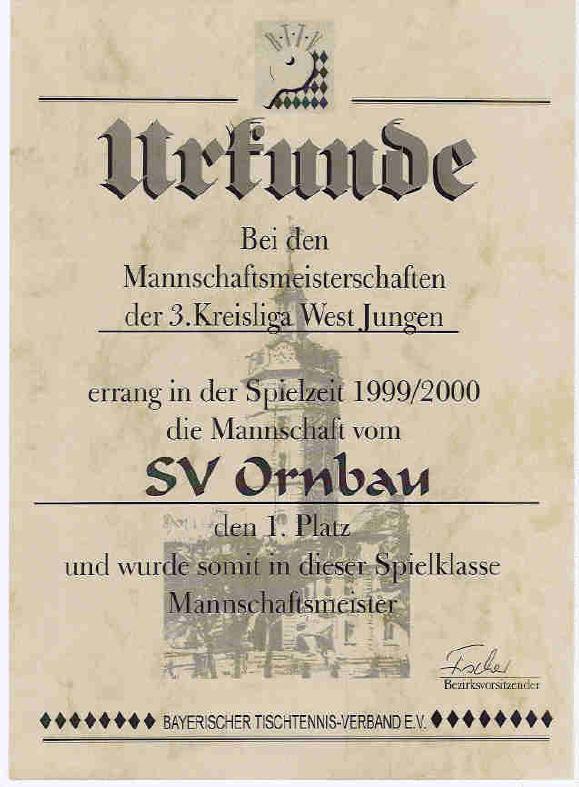 1999-2000 3. Kreisliga West Jungen stehend von links: Nägelein Andreas, Reißinger Heiko, Bittel Christian; knieend von links: Riedmüller Sebastian , Gemereth Klaus , Walter Sascha; nicht abgebildet: Weger Jonas