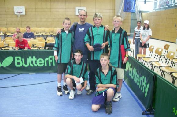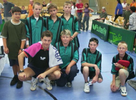 SVO-Jugend mit Timo Boll. Von links stehend: David Göttler, Dominik Broszeit, Chrsitian Schüssler, Sebastian Winter, von links knieend: Timo Boll, Lukas Gebauer, Peter Winter, Tobias Heinrichmeier