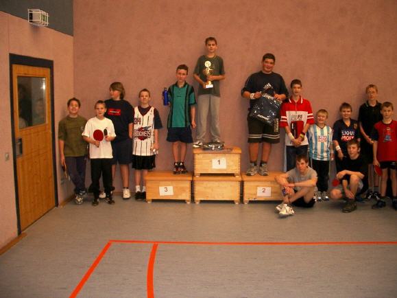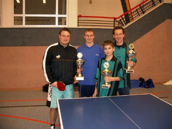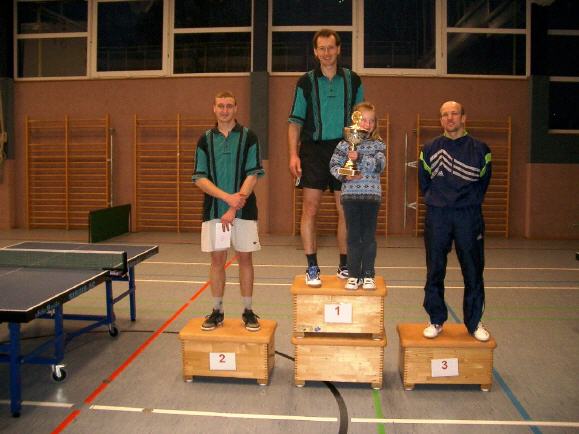 Gruppensiege in der Vorrunde. Für die Überraschung des Tages sorgte dann Christian Schüssler, der im Halbfinale den Mitfavoriten Martin Schalk mit einem 3:0 Sieg keine Chance ließ. Im Finale traf Christian Schüssler dann auf Titelverteidiger Sascha Walter, gegen den er im Vorrundenspiel noch unterlag. Im Endspiel drehte Christian Schüssler jedoch den Spieß um und siegte verdient mit 3:1 Sätzen gegen Sascha Walter, der kein Mittel gegen die konsequente Spielweise von Christian Schüssler fand. Das Spiel um Platz 3 konnte Martin Schalk gegen Andreas Engelhardt für sich entscheiden. Bei den Jugendlichen erfreute insbesondere die zahlreiche Teilnahme von 14 Aktiven.