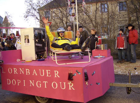 Im Jahr 2008 nahm die Tischtennisabteilung des SVO nach mehrjähriger Pause wieder am Ornbauer Faschingsumzug teil. Mit dem Thema "I. Ornbauer Doping-Tour" gelang wieder einmal ein Volltreffer. Die Bauarbeiten wurden in den beiden Samstagen vor dem Umzug in Bernhard´s Scheune erledigt.