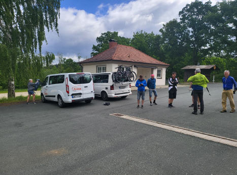 Am Samstag den 22. Mai trafen wir uns ab 8:30 Uhr zum Frühstück. Unsere Gewässertester Gerhard, Helmut und Meschi nahmen vorher noch ein kleines Morgenbad in einem nahegelegenen „Privatsee“! Fazit des „Cheftesters“: sauberster Badesee weit und breit. So etwas gibt es im Landkreis Ansbach nicht. Nach dem Auschecken ging es dann mit dem Bürgerbus zum nur wenige Minuten entfernten Parkplatz am Fuße des Staffelberges. Es war etwas wolkig und auch etwas windig, blieb aber den ganzen Tag trocken. Über Vierzehnheiligen (das übrigens nach unserem Besuch auf „Zweiundzwanzigheiligen“ umbenannt wurde) ging es dann weiter durch den Wald mit dem Ziel Hochplateau Staffelberg. Trotz Handynavigation haben wir uns anfangs etwas verlaufen und landeten erst auf dem Gipfel des „alten Staffelberges“. Dieser war jedoch auch sehr schön und bot eine fantastische Aussicht. Dann ging es weiter durch den Wald, teilweise steil bergab und wieder hoch zum Plateau des „richtigen“ Staffelberges. Beim Rundgang stießen wir auf eine im Boden befestigte Bronzerundplatte, die vermutlich „nicht“ aus der Keltenzeit stammt. Wenn man einen Stein auf die Platte wirft, wird angezeigt wohin unser nächster Ausflug geht, der Stein fiel auf Prag - soviel dazu!